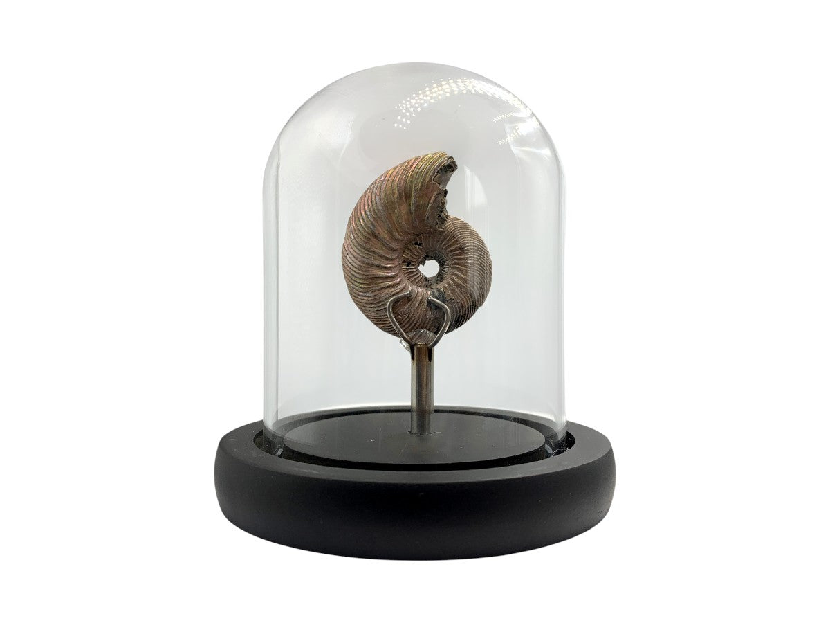 Amonite Nacarado con pirita, en capelo de cristal con base de madera.