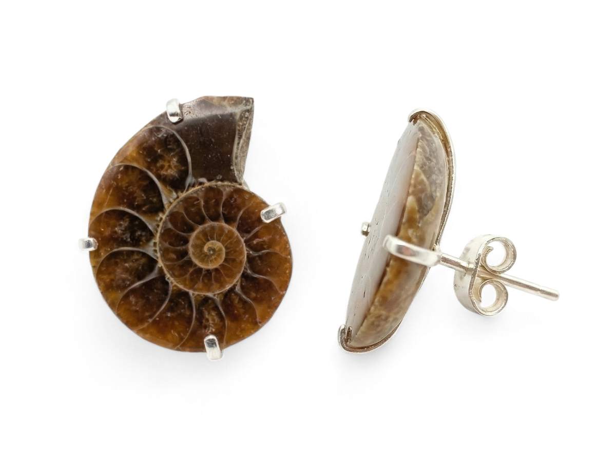 Aretes de plata .925 con Amonite fósil legítimo en presentación pulida , uñas de plata y broche mariposa.