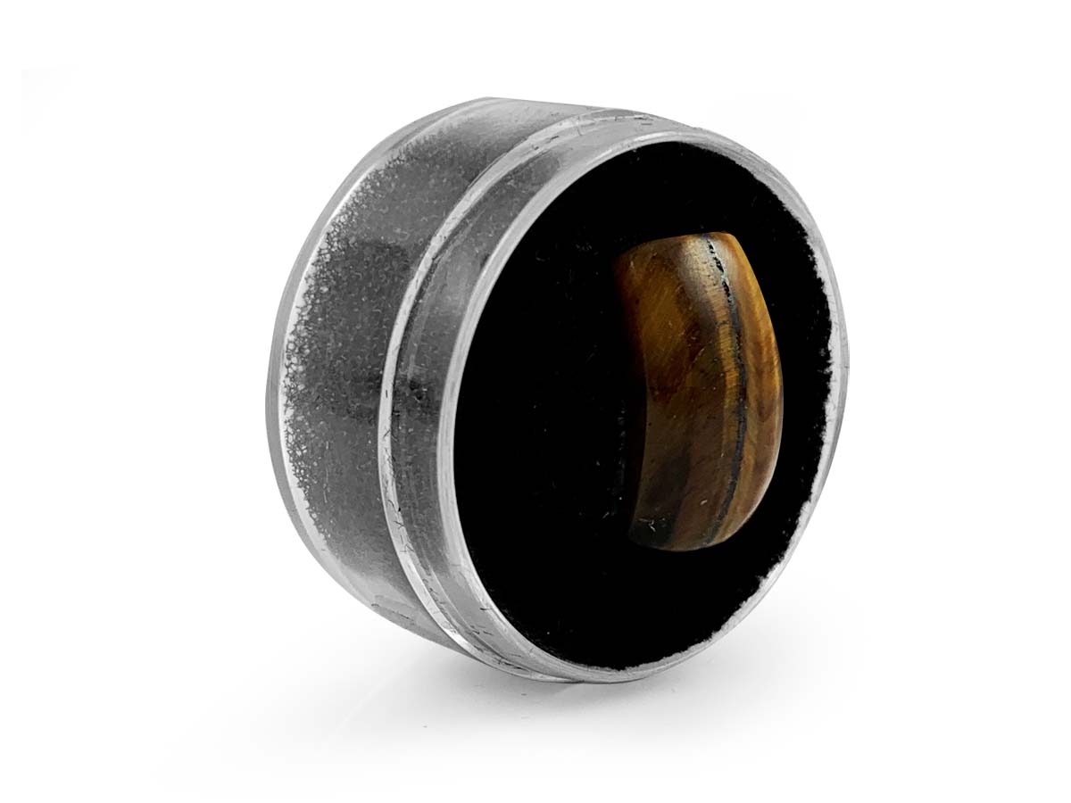 Cabujón de Ojo de Tigre mineral, pieza tallada en forma semi-circular 1/4 de dona, con bordes pulidos, cara convexa y base cóncava. Almacenaje en portacabujón de acrílico.