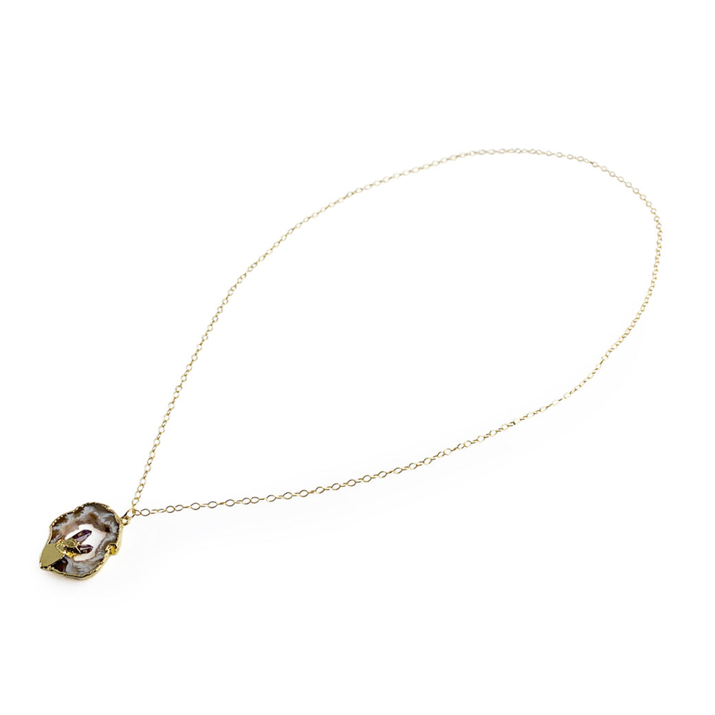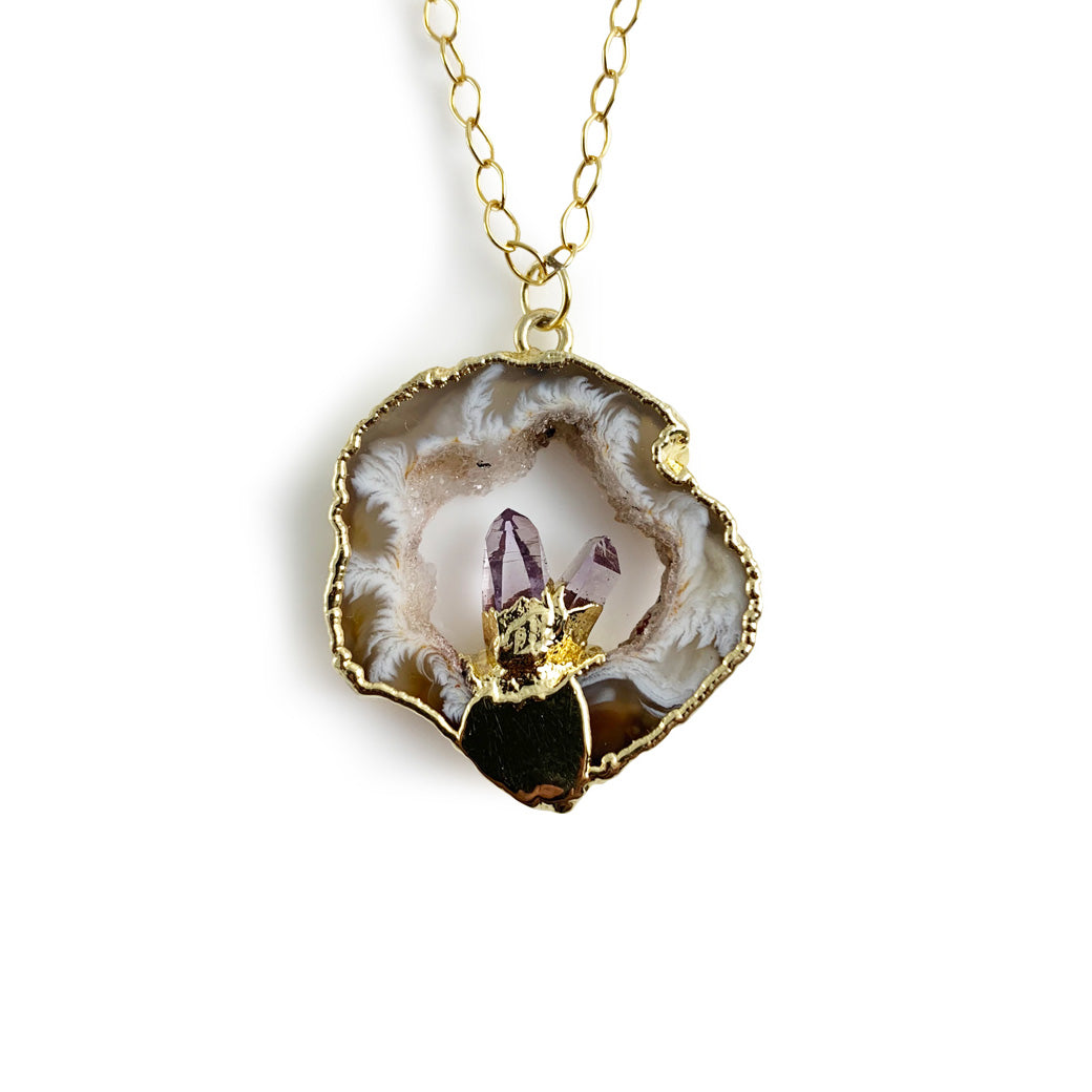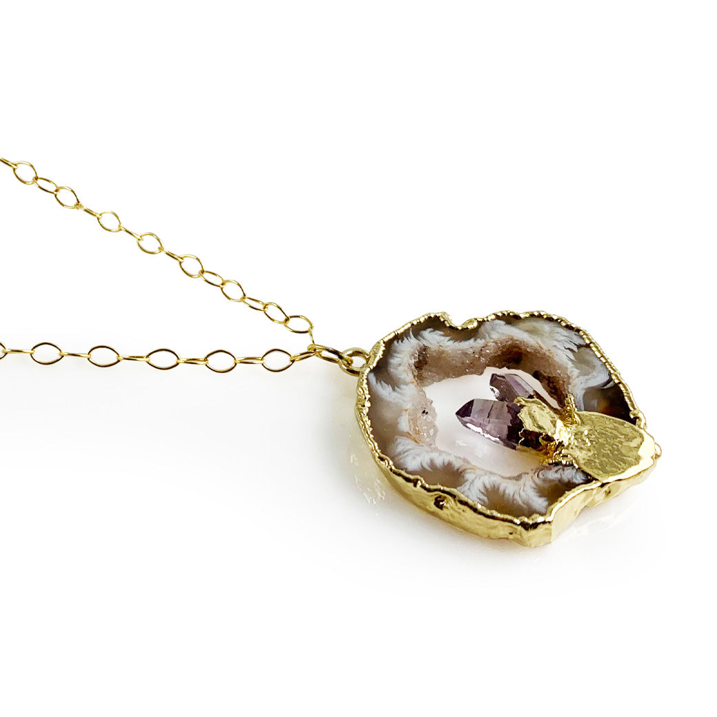Collar largo con cadena de estaño en baño dorado y centro rebanada de Geoda elctroformada con punta Amatista.