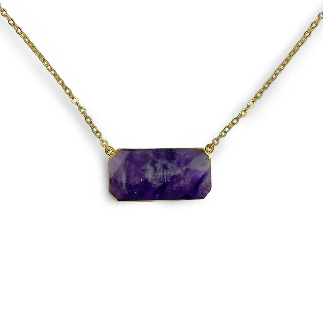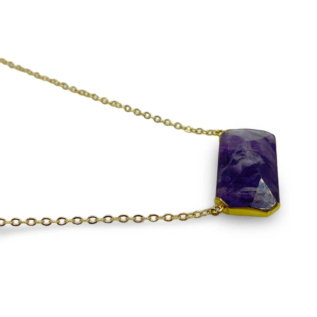 Collar corto cadena dorada con centro rectangular de Amatista facetada.