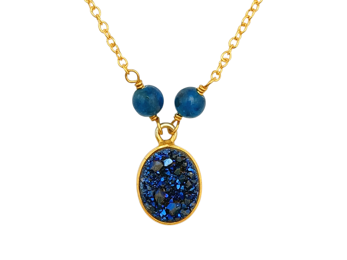 Collar corto con cadena de plata .925 en baño dorado con esferas de Apatito azul, centro dije Cuarzo Titanio.