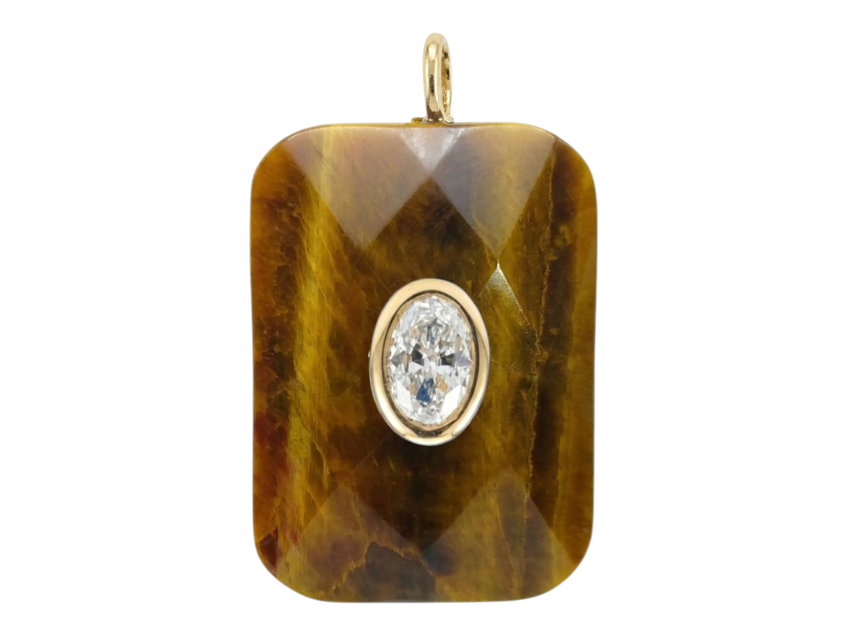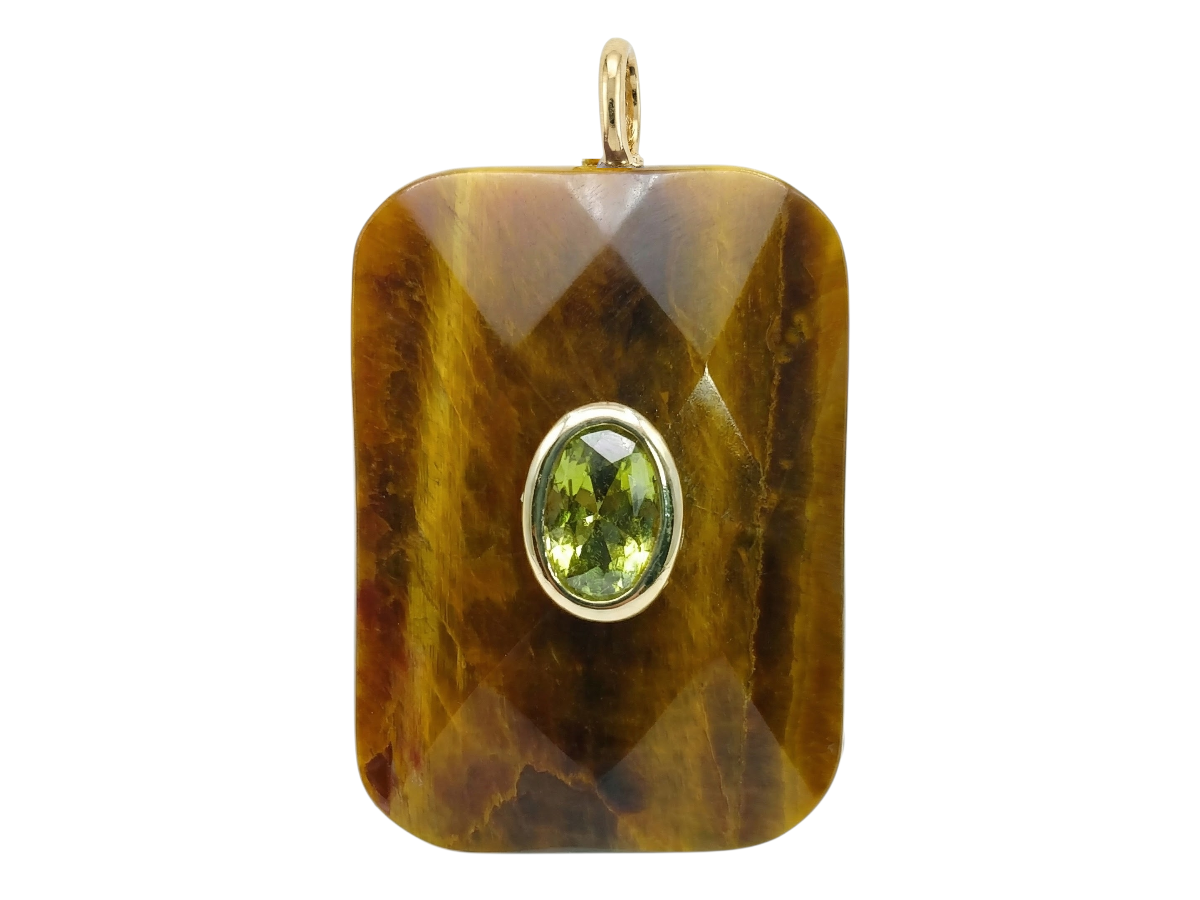 Dije facetado Ojo de Tigre mineral ,forma rectangular con incrustación de Citrino o Cuarzo Blanco.