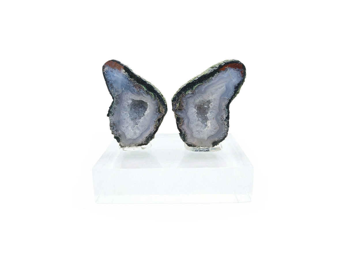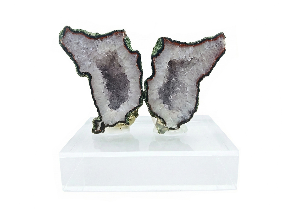 Espécimen Geoda de colección, con capa externa de ágata y cristales diminutos de cuarzo en su interior, sobre una base de acrílico.