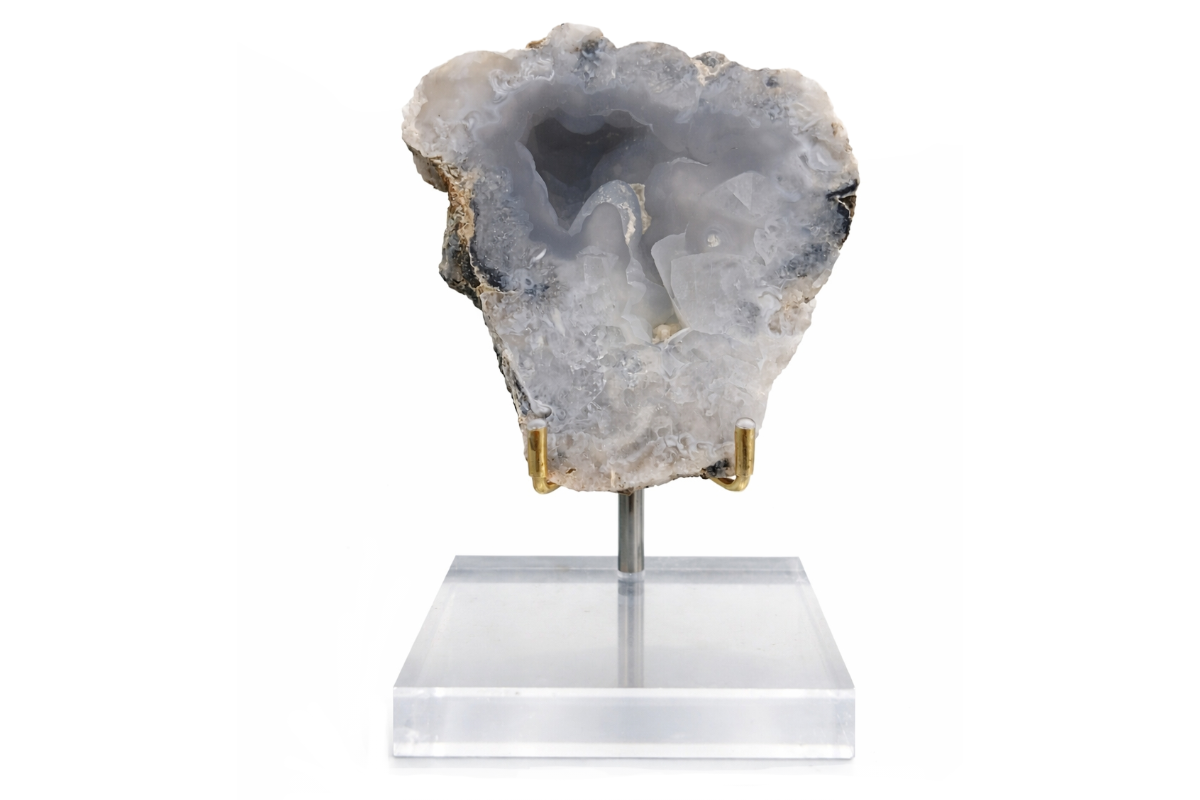 Mitad Geoda Mexicana con base acrílico y soporte de metal dorado.