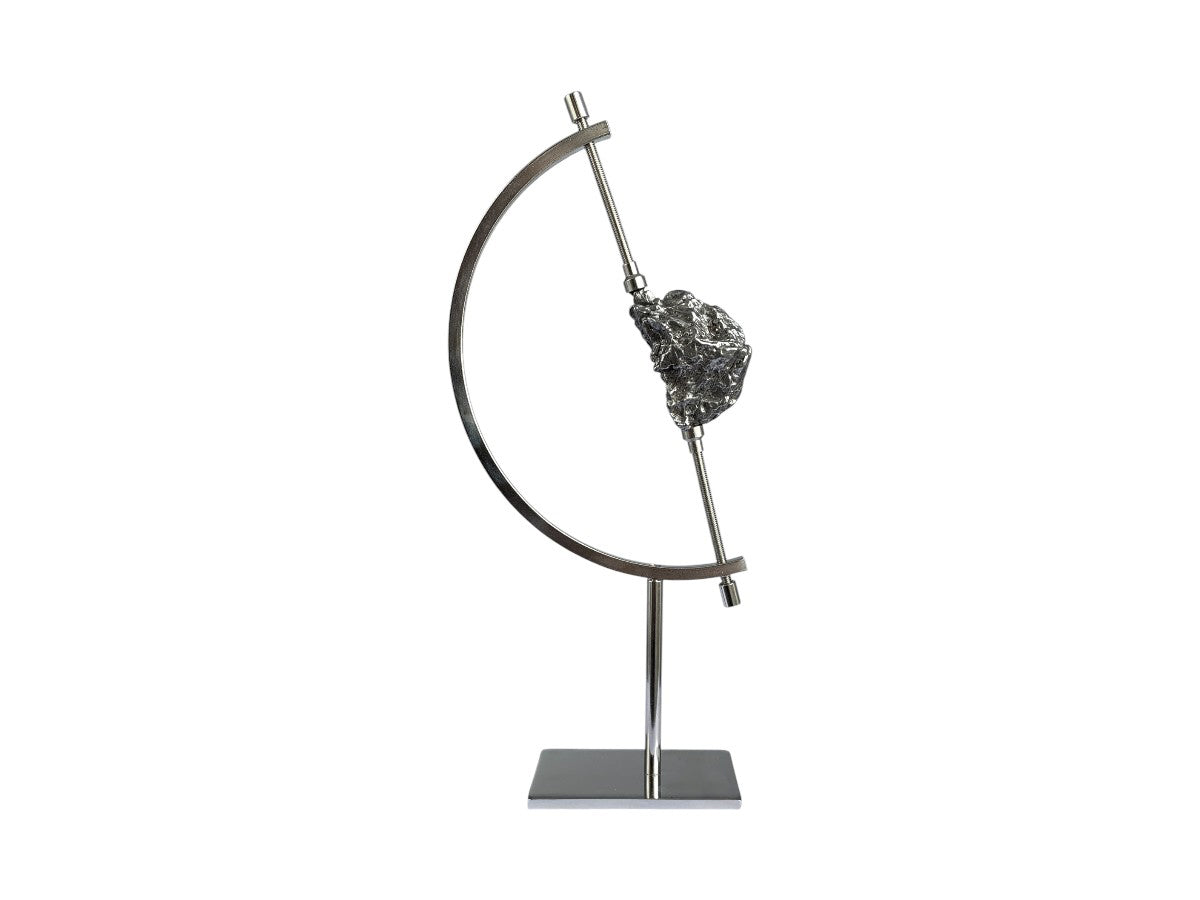 Meteorito Campo del Cielo Argentina forma irregular, sobre base de metal plateada en forma media luna.