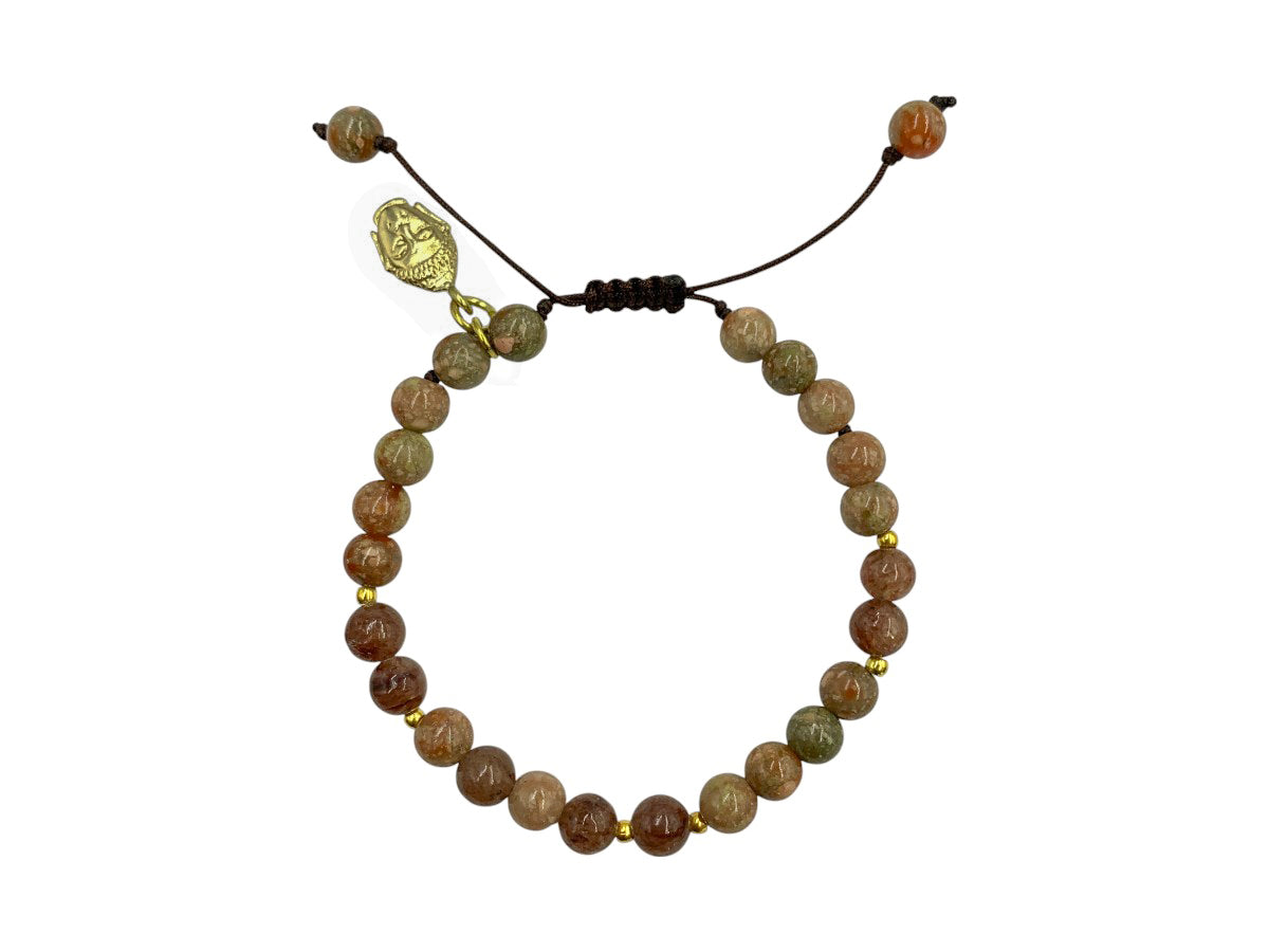Pulsera con esferas de Unakita y Cuarzo Cherry mineral 6mm, dije de cabeza de Buda metálica dorada y anillos dorados mini, engarzada en hilo mostaza, terminado en puntas con esferas y cierre panza de víbora. Pieza ajustable.