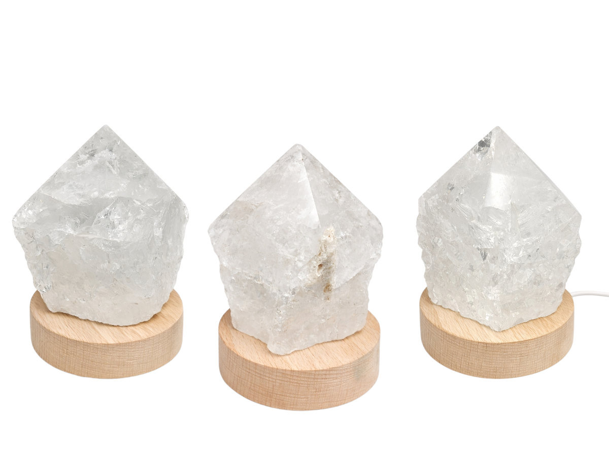 Punta iluminada de Cuarzo Blanco lapidada con caras pulida en cuerpo rústico, base de madera con iluminación led de entrada USB.